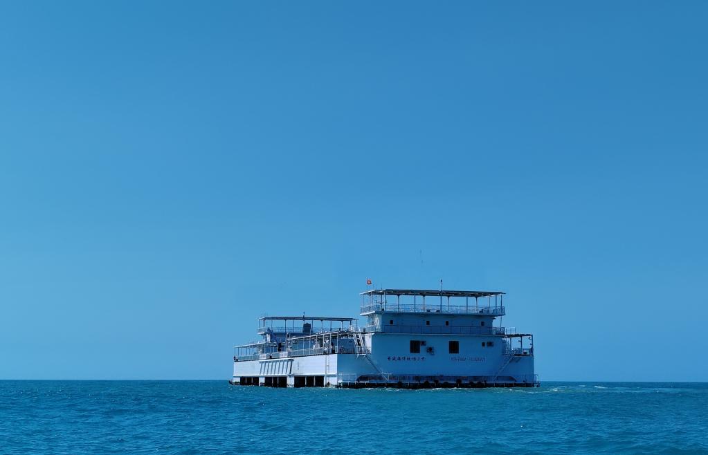 從海南省樂(lè)東黎族自治縣龍棲灣向外約8海里,可以看到“普盛海洋牧場(chǎng)3號(hào)”如同一艘白色郵輪泊在蔚藍(lán)色的大海之中。