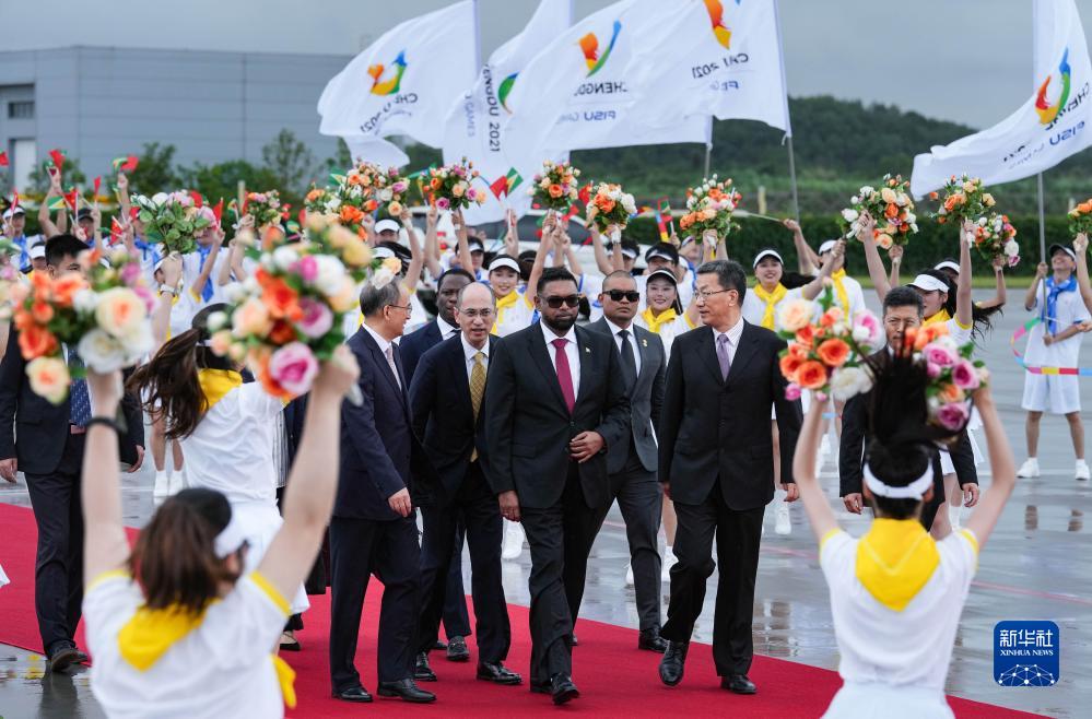 7月27日下午,來華出席成都大運(yùn)會(huì)開幕式并訪問的圭亞那總統(tǒng)阿里抵達(dá)四川省成都市。