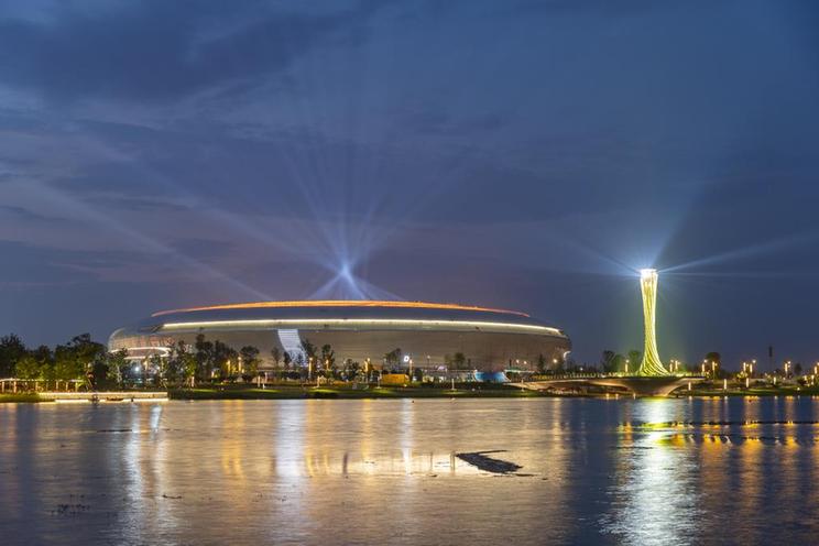 這是在成都市龍泉驛區(qū)拍攝的夜幕下的東安湖體育公園(7月18日攝)。新華社記者 黃偉 攝