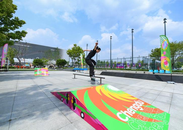4月19日,滑板愛好者在成都東安湖體育公園練習(xí)滑板。新華社記者 王曦 攝