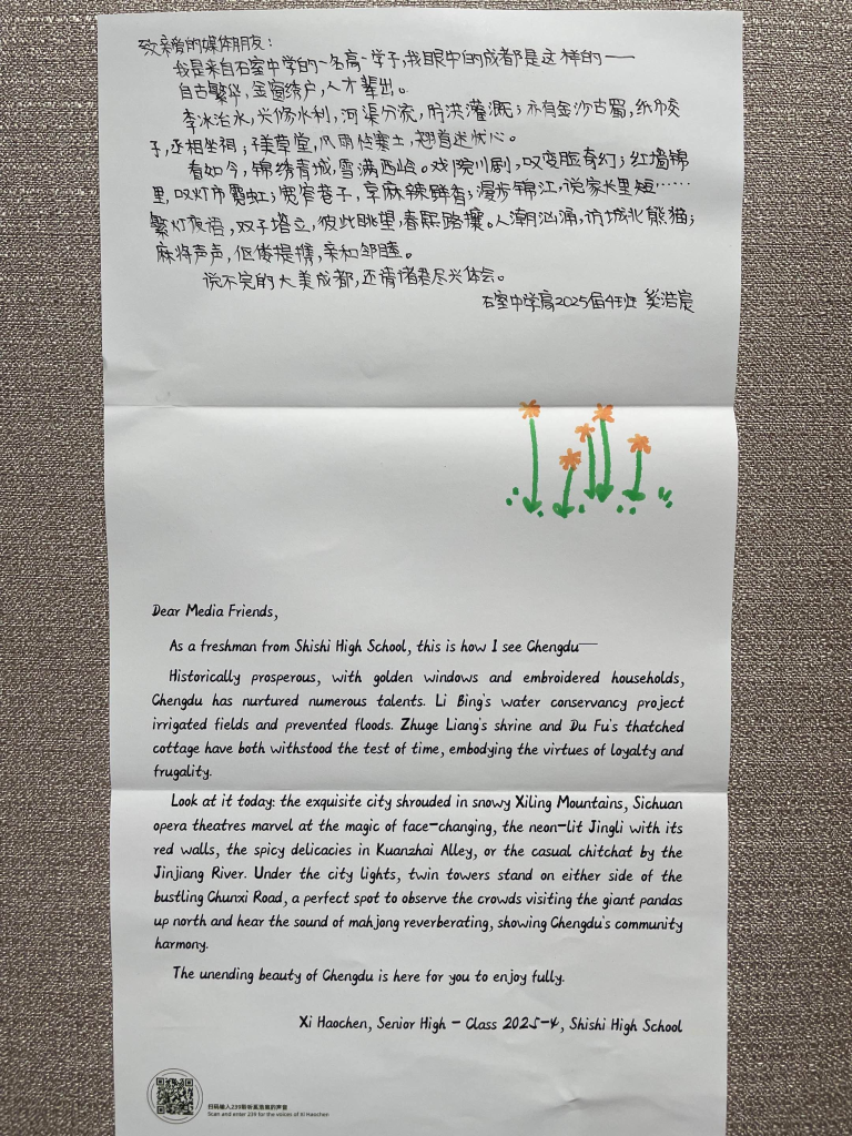 ↑圖為四川省成都市石室中學(xué)高2025屆4班奚浩宸親筆書寫的信件。