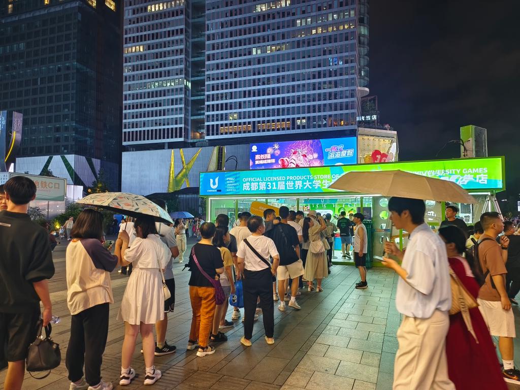 ↑7月27日,人們在成都市一家成都大運(yùn)會特許商品零售店門前排隊。