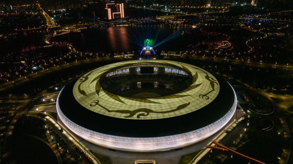 ↑這是4月19日拍攝的第31屆世界大學(xué)生夏季運(yùn)動會開幕式主體育場及主火炬(無人機(jī)照片)