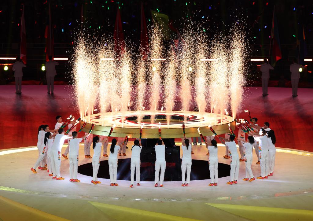新華社成都7月28日電(記者趙建通、袁秋岳、曹奕博、周勉)跨越三千年而來的“太陽神鳥”圣火盤被點(diǎn)燃,焰火盤旋向上,體育場上空煙花絢麗四射,將場外的主火炬塔引燃,圣火熊熊燃燒,在夜空中綻放出璀璨奪目的光芒。