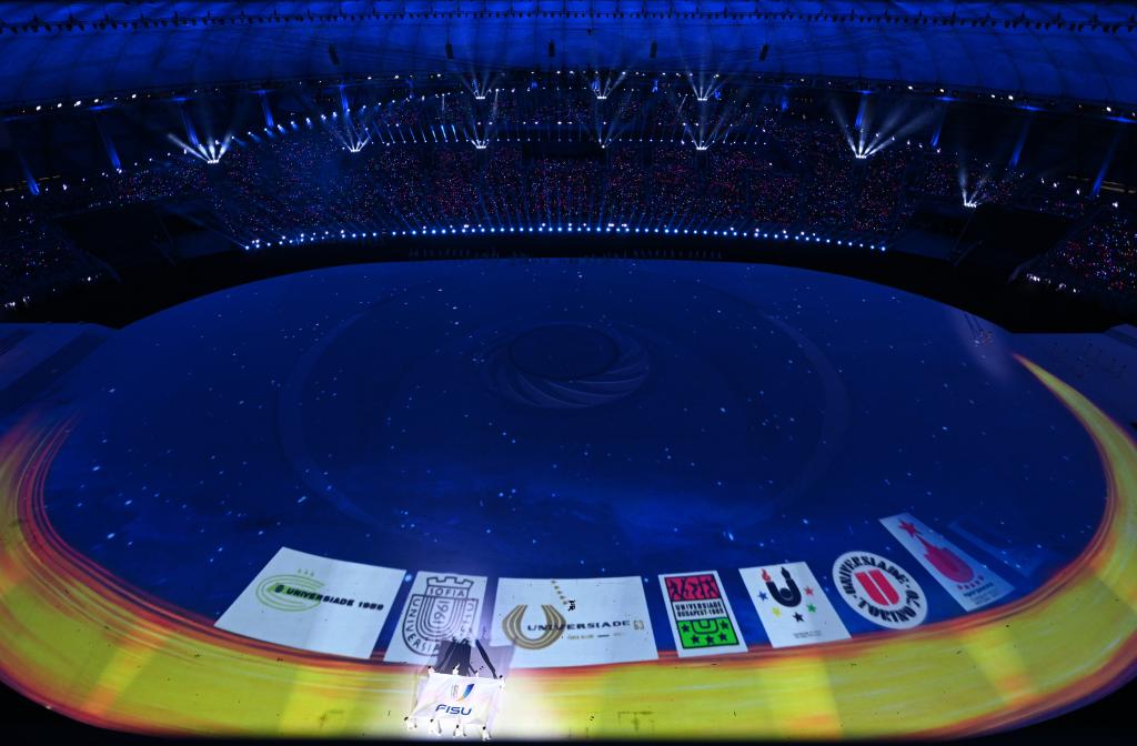 7月28日,國際大學(xué)生體育聯(lián)合會(huì)會(huì)旗在開幕式上入場。新華社記者劉磊攝