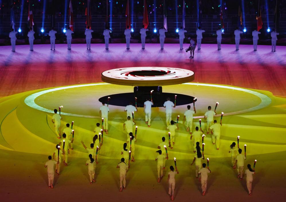 7月28日,火炬手在成都大運(yùn)會(huì)開幕式上入場。新華社記者 李欣 攝