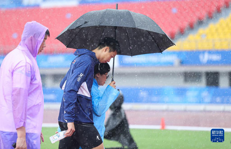 8月3日,中國選手陳業(yè)森在男子十項全能撐竿跳高比賽因雨中斷后離開賽場。新華社記者 李京 攝