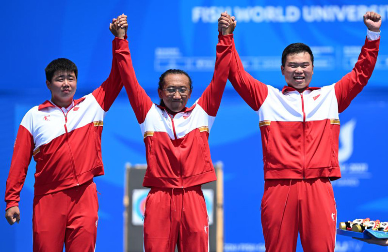 7月30日,中國隊選手陳巖松、杜美余、王世坤(從左至右)在頒獎儀式上。當(dāng)日,在成都舉行的第31屆世界大學(xué)生夏季運動會男子復(fù)合弓團體金牌賽中,中國隊以231環(huán):224環(huán)戰(zhàn)勝法國隊,獲得冠軍。新華社記者 張龍 攝