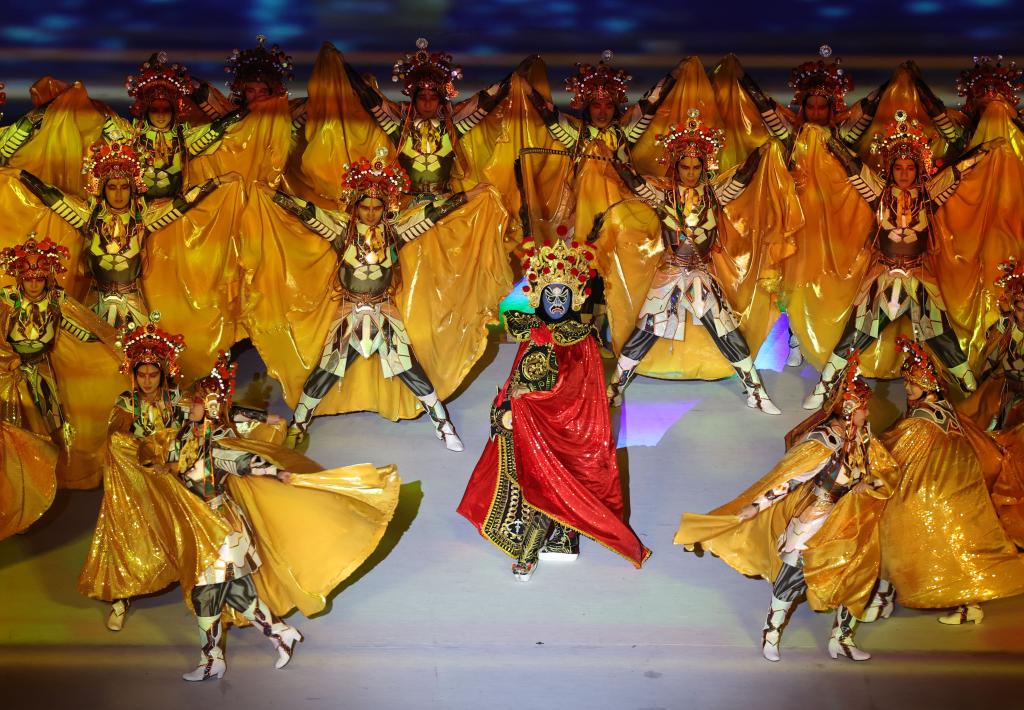 7月28日,演員在大運(yùn)會開幕式上表演川劇變臉。新華社記者江宏景攝