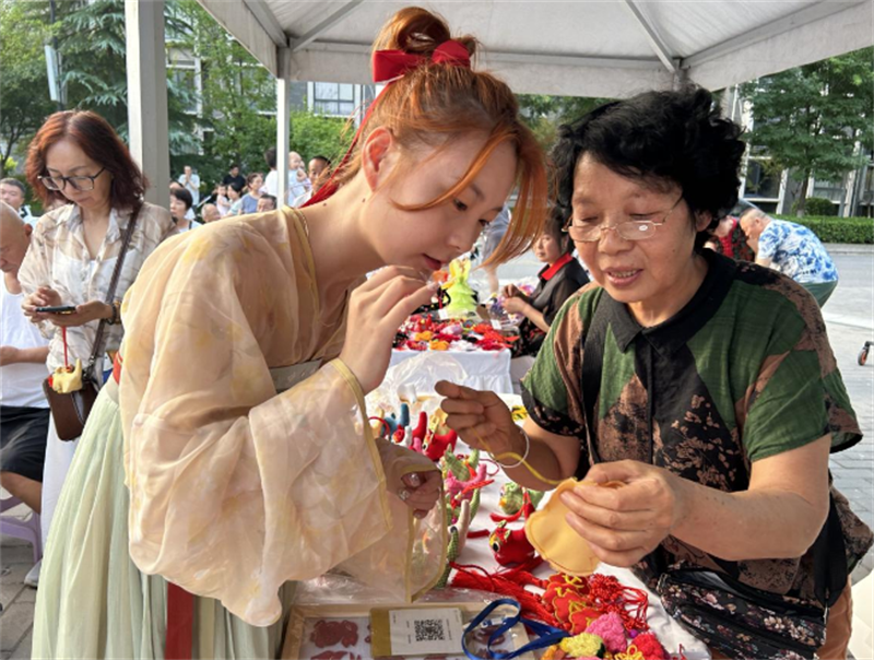 在民俗文化體驗(yàn)區(qū),幾位身著華彩漢服的年輕人在非遺傳承老師的指導(dǎo)下,凝神屏氣,手執(zhí)五色絲線,連續(xù)穿針引線……“穿針乞巧”活動(dòng)吸引了眾多市民駐足觀看。“這個(gè)活動(dòng)特別有意思,讓我們這些‘00’后能親手體驗(yàn)這些非常陌生的傳統(tǒng)手藝,了解感受中華傳統(tǒng)文化的深厚底蘊(yùn)?!笔忻耜惻磕弥约簞?dòng)手制作的扎花說(shuō)。另一邊,一道“古詩(shī)詞鵲橋”吸引了眾多市民打卡留影,帶領(lǐng)大家了解“七夕節(jié)”的起源、習(xí)俗,重溫牛郎織女的美麗愛(ài)情故事,認(rèn)知傳統(tǒng)文化風(fēng)韻……一系列特色民俗文化活動(dòng),讓市民們乘興而歸。