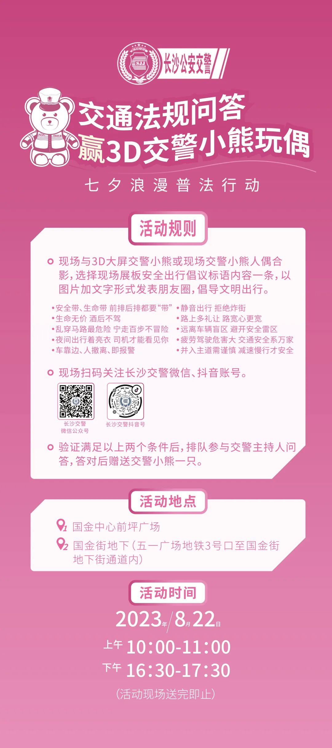 “七夕”當(dāng)天(上午10:00-11:00、下午16:30-17:30),分別在國金中心前坪和國金街地下通道大屏前設(shè)置兩個普法互動打卡點,開展普法宣教互動贈送長沙交警小熊玩偶活動。現(xiàn)場民警將開展普法宣傳,邀請市民參與“交通法規(guī)問答贏交警小熊玩偶”活動, 通過答題和游戲互動可獲得“交警小熊”玩偶一只。(注意,是必得哦)