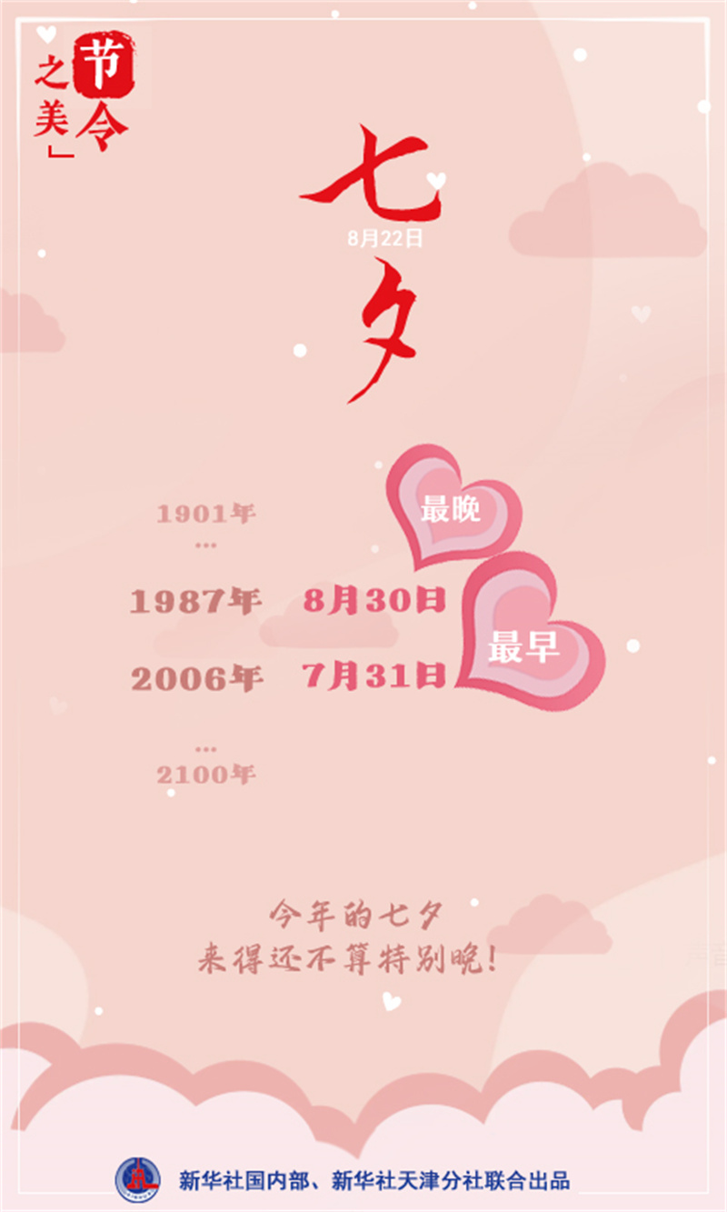 今年的七夕是來得最晚的嗎?不是!1901年至2100年這200年的統(tǒng)計(jì)結(jié)果顯示,七夕對應(yīng)的公歷日期最早可落在7月31日(如2006年),最晚可落在8月30日(如1987年),這也意味著,公歷7月31日至8月30日中的任何一天都有可能成為七夕。照此來看,今年的七夕來得還不算特別晚。