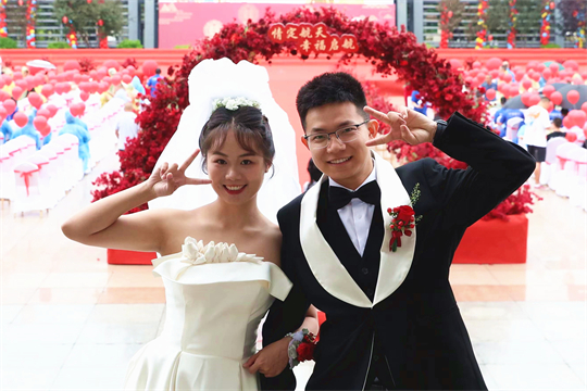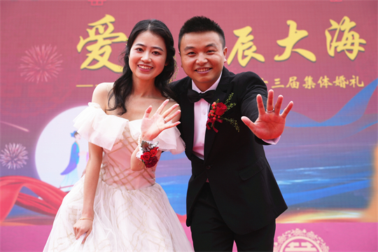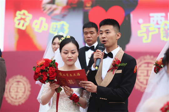 舞臺(tái)、氣球精心裝扮,美景、佳人喜迎幸?!槎Y現(xiàn)場,新郎們身著深色西裝,筆挺英俊;新娘們身穿潔白婚紗,美麗動(dòng)人。一個(gè)個(gè)精心設(shè)置的儀式,一張張洋溢幸福的笑臉,讓這場集體婚禮甜蜜加倍、幸福爆表。