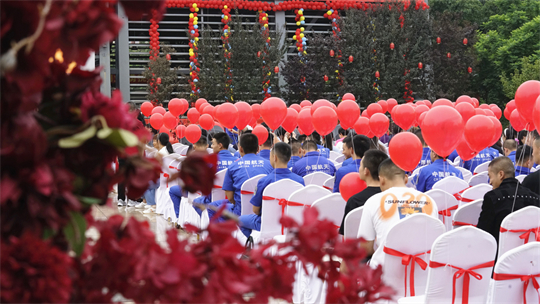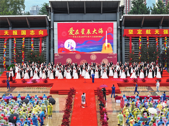 “星辰大海,夢想自有夢想的力量,仰望在銀河的想象,我們起航……”活動(dòng)最后,全體新人與觀禮人員共同合唱《星辰大?!?。愛在星辰大海,新人們把愛的誓言唱響在航天大院,幸福的歌聲在青山之間久久回蕩……