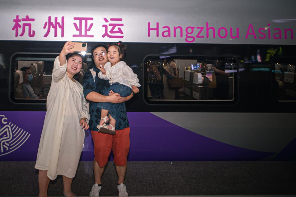 9月16日,在杭州東站站臺,乘客與復(fù)興號亞運智能動車組列車合影留念。 新華社記者 江漢 攝