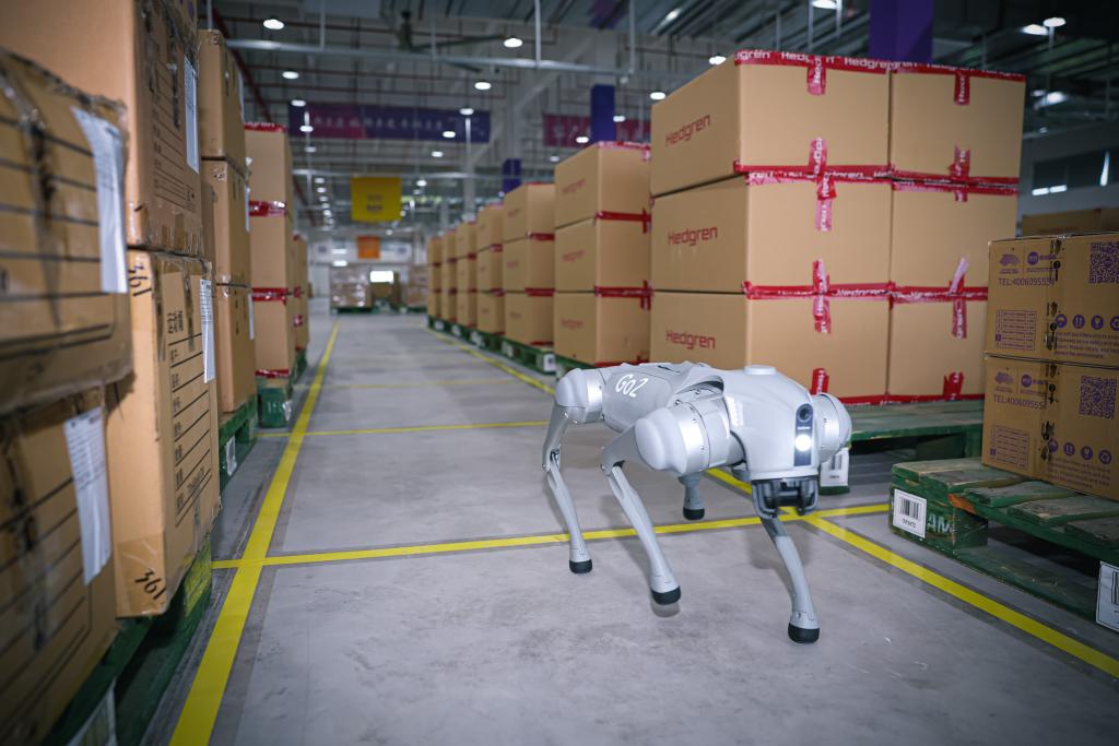 9月13日,機器狗在杭州亞運會物流中心內(nèi)執(zhí)行巡檢工作。新華社記者江漢 攝