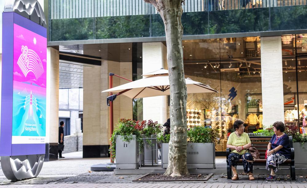 9月20日,市民在亞運(yùn)會主題標(biāo)識牌旁的長椅上聊天。 新華社記者顏麟蘊(yùn) 攝