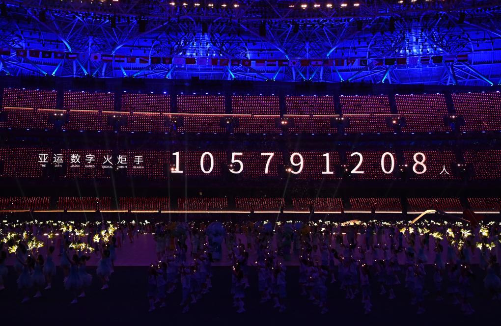 這是9月23日拍攝的開(kāi)幕式現(xiàn)場(chǎng)顯示的亞運(yùn)數(shù)字火炬手人數(shù)。新華社記者 黃宗治 攝