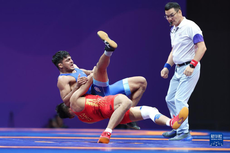 當(dāng)日,在杭州亞運會摔跤項目男子古典式77公斤級四分之一決賽中,中國選手劉瑞戰(zhàn)勝印度選手維卡斯,晉級半決賽。