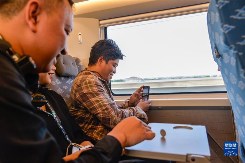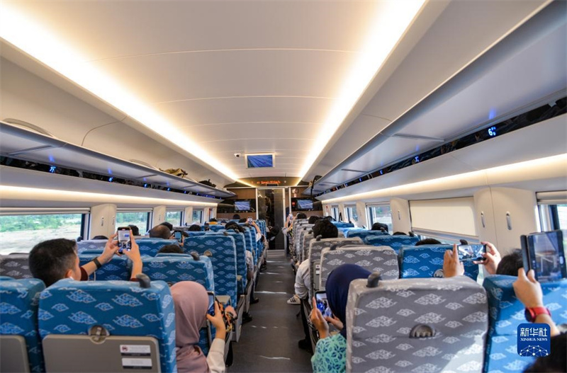 10月17日,乘客在行駛中的雅萬高鐵高速動(dòng)車組列車車廂內(nèi)拍照。新華社記者 徐欽 攝