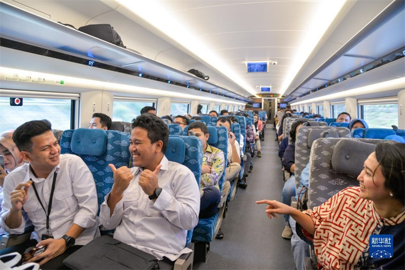 10月17日,乘客在行駛中的雅萬高鐵高速動(dòng)車組列車車廂內(nèi)交談。新華社記者 徐欽 攝