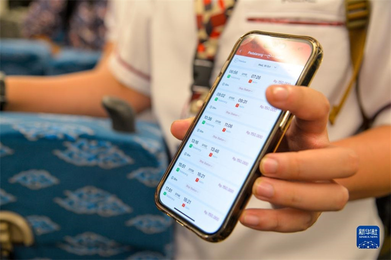 10月17日,一名乘客在行駛中的雅萬高鐵高速動(dòng)車組列車車廂內(nèi)展示雅萬高鐵購(gòu)票手機(jī)應(yīng)用。新華社記者 徐欽 攝