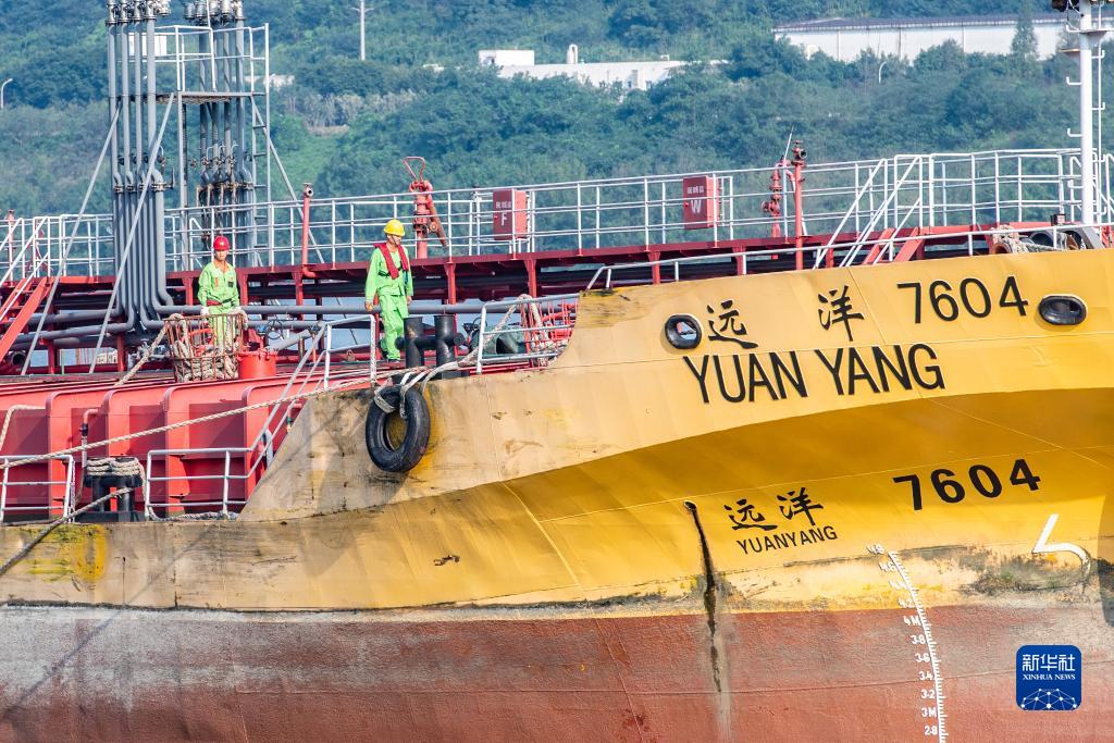 10月17日,在中國石化集團(tuán)重慶川維化工有限公司物流碼頭,工作人員在檢查出口產(chǎn)品裝船情況。
