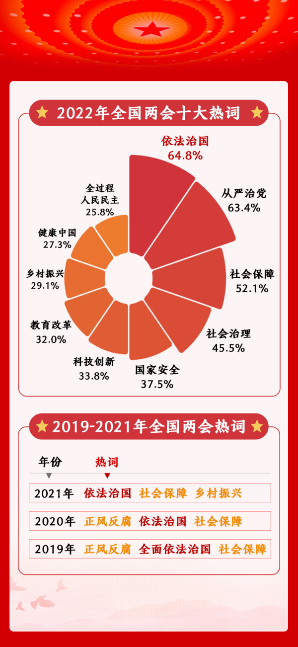 2022年,人民網(wǎng)開(kāi)展的全國(guó)兩會(huì)調(diào)查評(píng)選出十大熱詞。調(diào)查結(jié)果顯示,“依法治國(guó)”“從嚴(yán)治黨”“社會(huì)保障”三大熱詞關(guān)注度位居前三位。其中,“依法治國(guó)”最受關(guān)注,選擇該熱詞的網(wǎng)民占比64.8%。