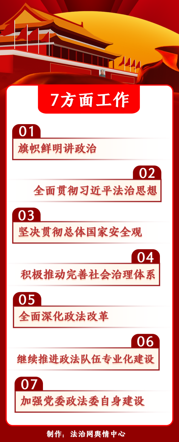 會議要求抓好七方面工作:旗幟鮮明講政治;全面貫徹習(xí)近平法治思想;堅(jiān)決貫徹總體國家安全觀;積極推動(dòng)完善社會治理體系;全面深化政法改革;持續(xù)推進(jìn)政法隊(duì)伍專業(yè)化建設(shè);加強(qiáng)黨委政法委自身建設(shè)。