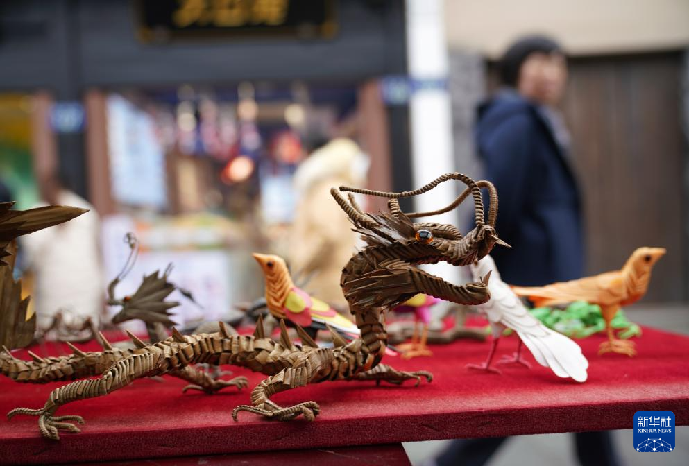 杭州河坊街商戶攤位上的棕編龍手工藝品(1月15日攝)。