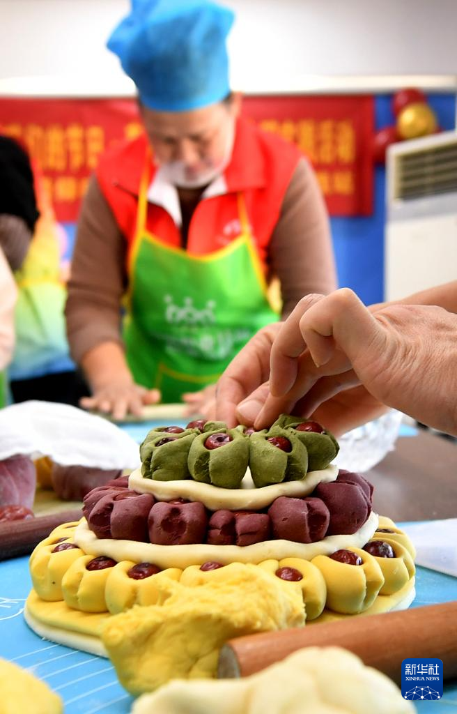 1月15日,在山東省青島市市南區(qū)湛山街道仰口路社區(qū),居民展示制作的壽桃花饃。