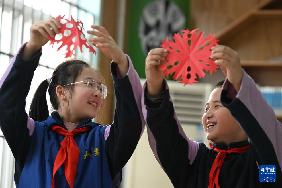 1月15日,河北省石家莊市裕華西路小學(xué)的學(xué)生在校園廟會活動中展示自己剪的窗花。