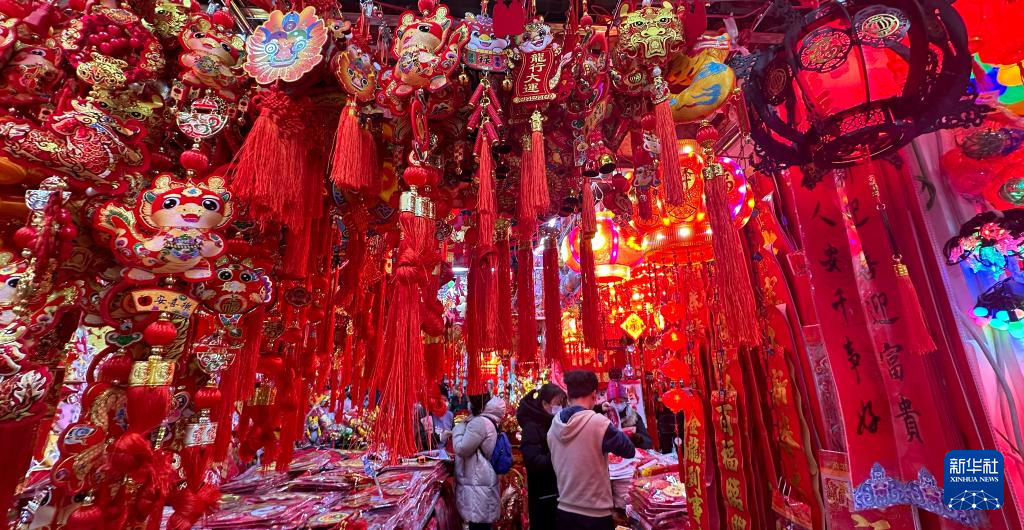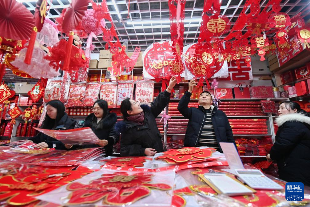 1月20日,人們?cè)诤颖笔∈仪f市南三條年貨批發(fā)市場(chǎng)選購(gòu)春節(jié)飾品。新華社發(fā)(梁子棟攝)