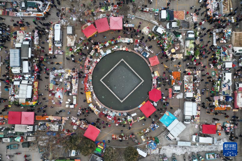 1月20日,人們?cè)谏綎|省濟(jì)南市二七新村南路附近的山水大集上選購(gòu)年貨(無(wú)人機(jī)照片)。新華社發(fā)(郝鑫城攝)