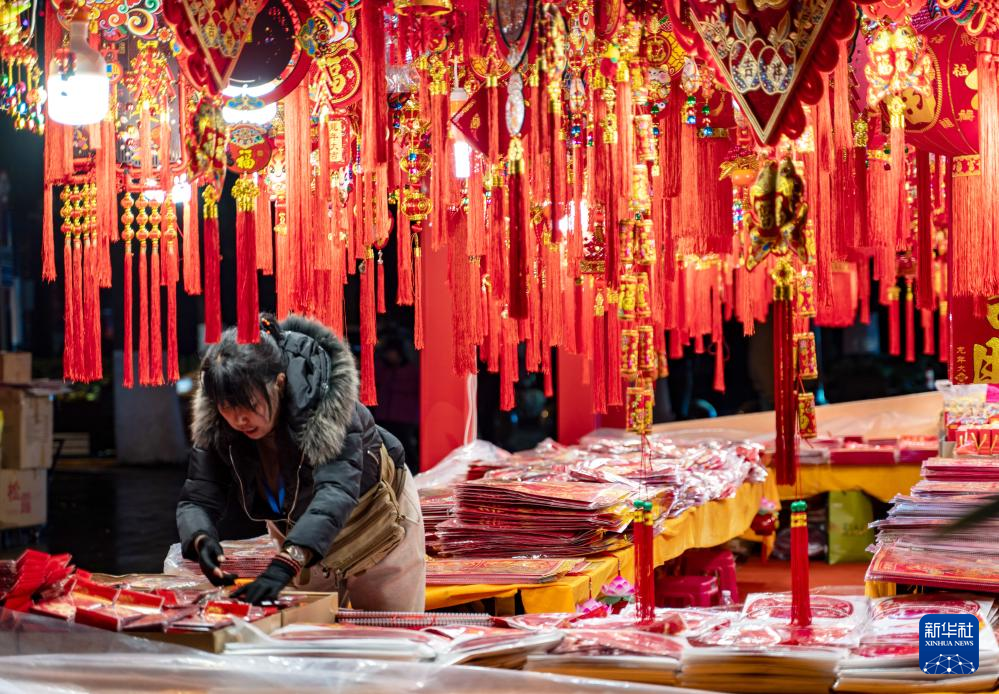 商戶在昆明翠湖年貨街上整理節(jié)慶飾品(1月16日攝)。