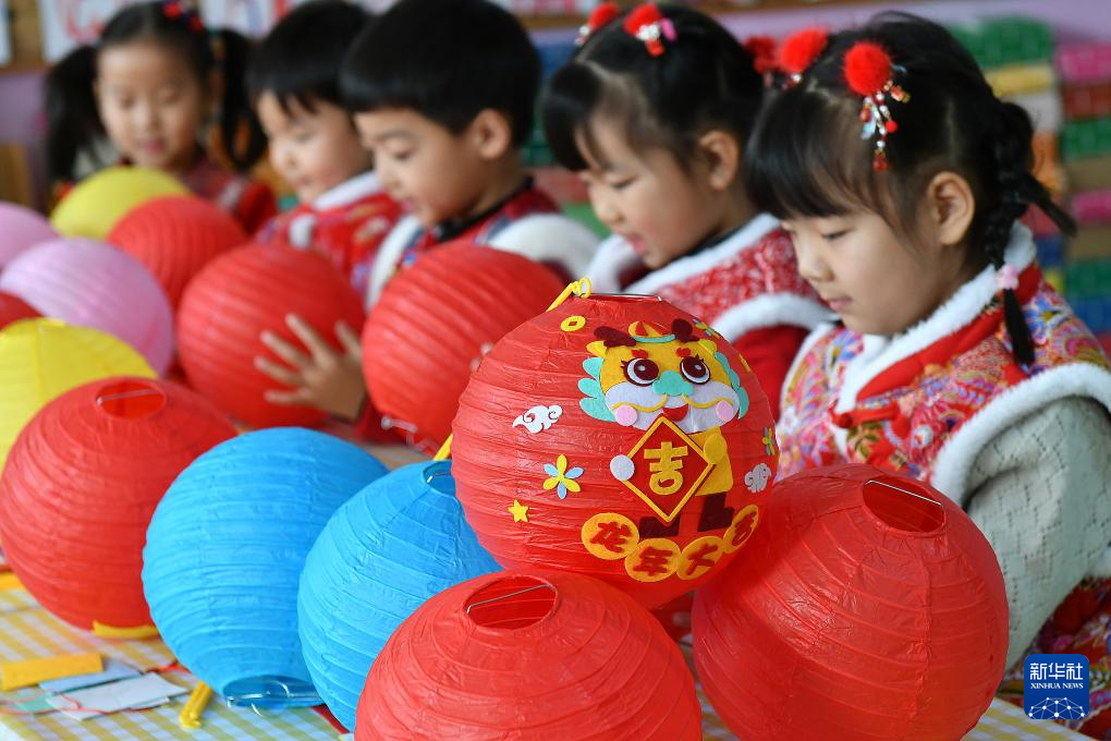 1月16日,山東省煙臺市福山區(qū)清洋街道中心幼兒園的小朋友在制作燈籠。
