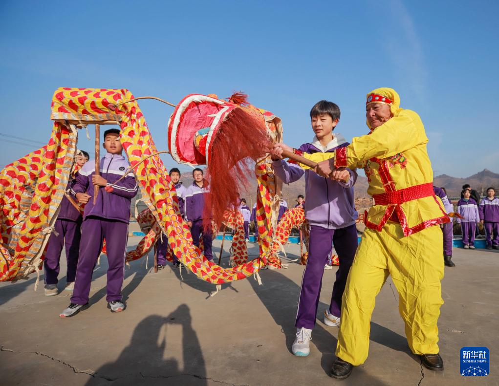 1月16日,在河北省遵化市小廠鄉(xiāng)洪山口九年一貫制學(xué)校,民間藝人向?qū)W生傳授舞龍技能。