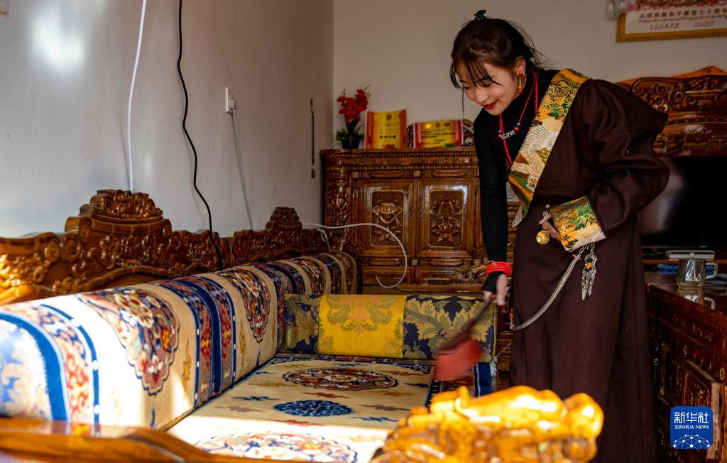 丹增在森布日生態(tài)搬遷安置點的新家打掃房間(1月24日攝)。
