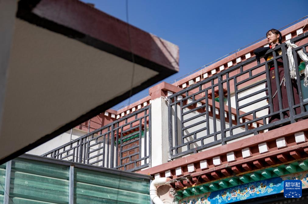 丹增在森布日生態(tài)搬遷安置點的新家陽臺上看風景(1月24日攝)。