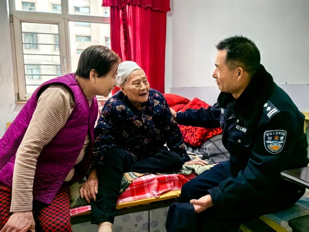 圖為民警王剛來(lái)到95歲的魏大娘家中進(jìn)行春節(jié)慰問(wèn),并提供便民服務(wù)。