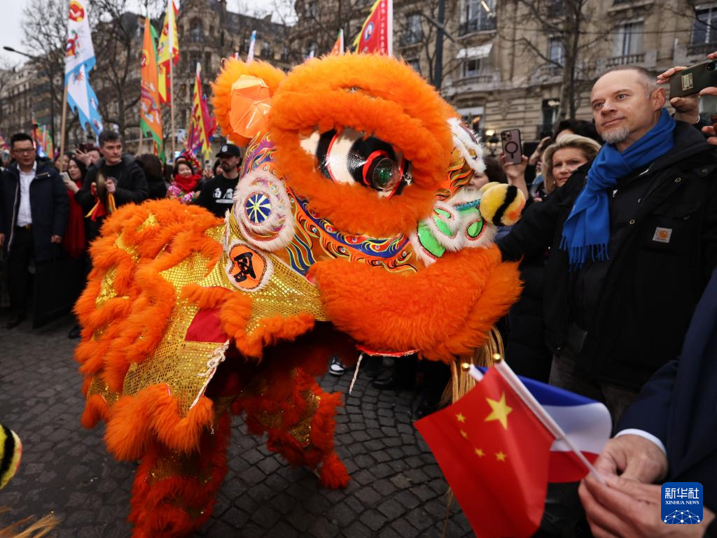 2月4日,人們在法國巴黎香榭麗舍大街觀看舞龍舞獅表演。