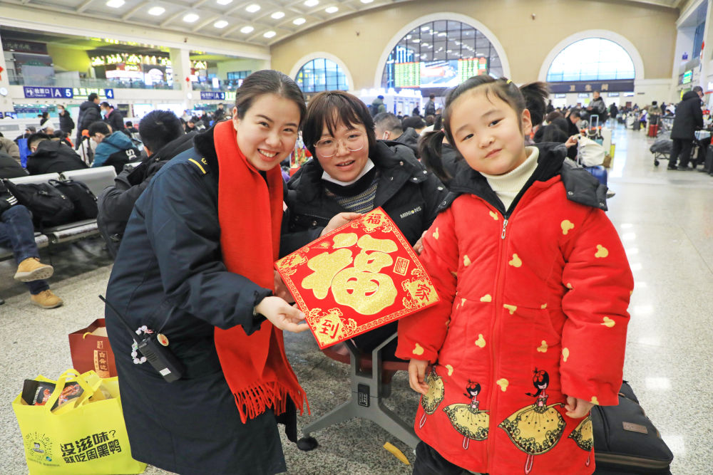 湖北武漢漢口火車(chē)站工作人員為候車(chē)旅客送“?!弊郑?月2日攝)。新華社發(fā)(邱晟 攝)