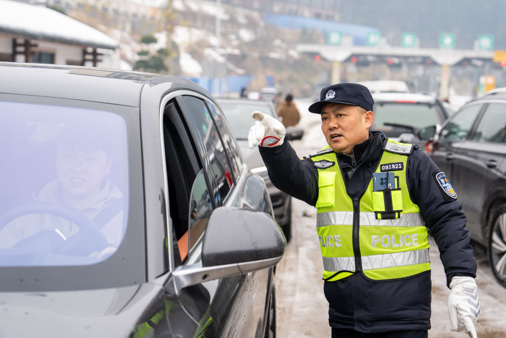 在湖南長(zhǎng)張高速慈利東收費(fèi)站附近,交警解答旅客的提問(wèn)(2月6日攝)。新華社記者 陳思汗 攝