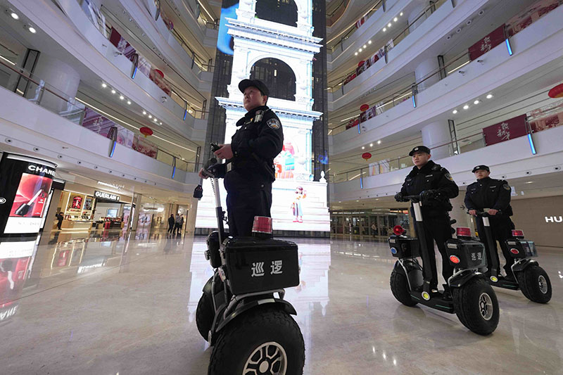 圖為湖北省武漢市公安局武昌區(qū)分局梅苑派出所民警駕駛平衡車(chē)在武商夢(mèng)時(shí)代廣場(chǎng)內(nèi)部巡邏。孫遜/攝