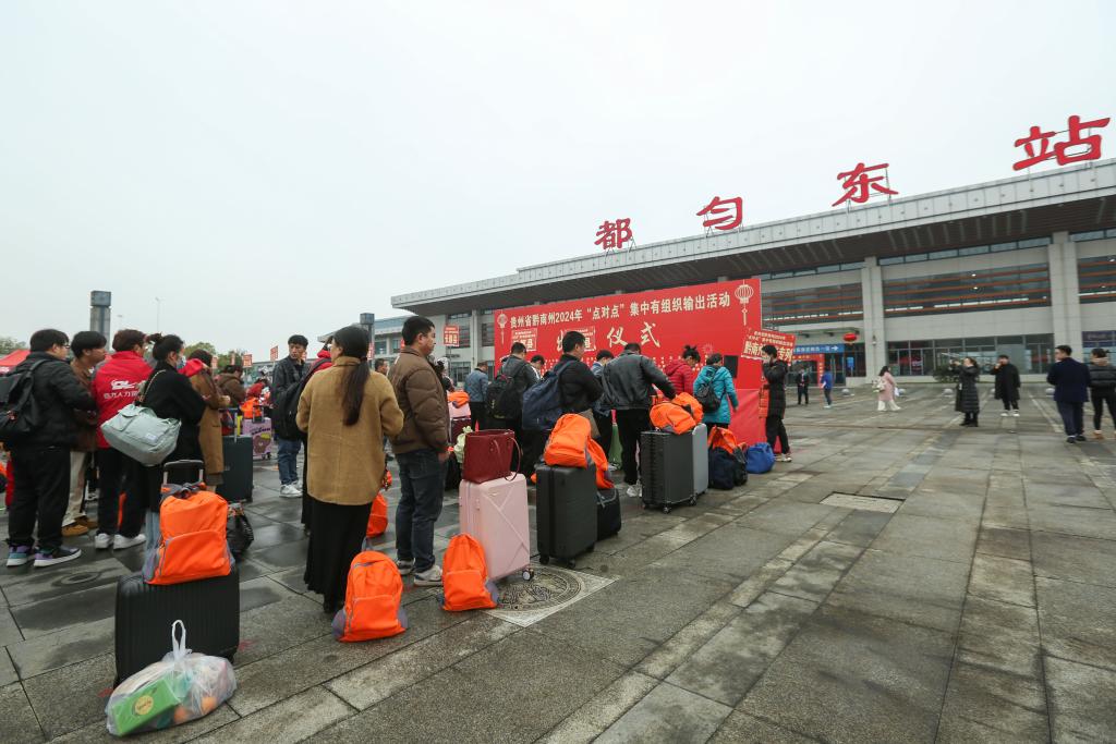 2月17日,來自貴州省黔南布依族苗族自治州各縣市的返崗務(wù)工人員在都勻東站廣場等待進(jìn)站,準(zhǔn)備乘坐返崗務(wù)工專列。新華社發(fā)(肖偉 攝)