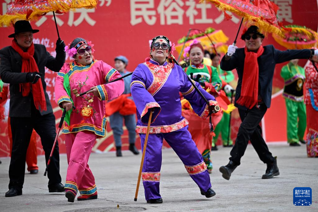 2月20日,在寧夏銀川市,參賽社火隊(duì)的演員表演傳統(tǒng)社火項(xiàng)目。
