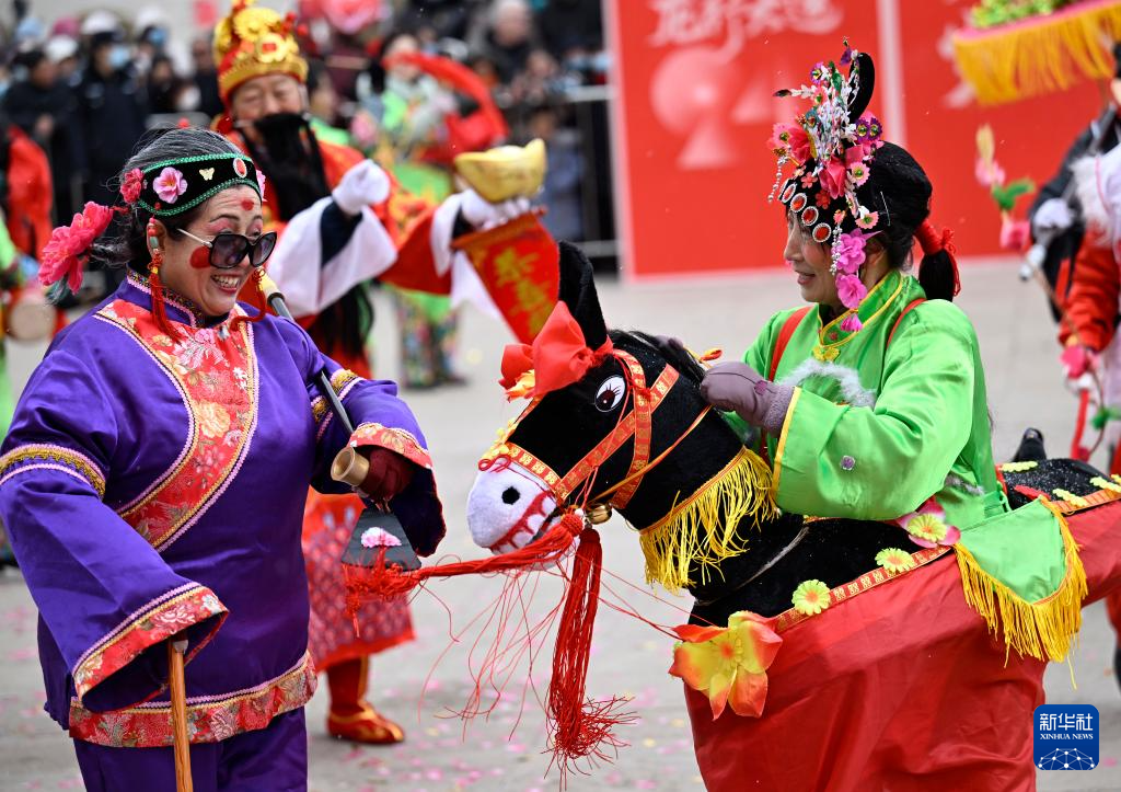 當(dāng)日,寧夏銀川市社火聯(lián)賽首場比賽在興慶區(qū)光明廣場舉行。來自銀川市興慶區(qū)、賀蘭縣的多支社火隊為市民獻(xiàn)上秧歌、舞龍、舞獅等傳統(tǒng)社火項目,喜迎元宵佳節(jié)的到來。