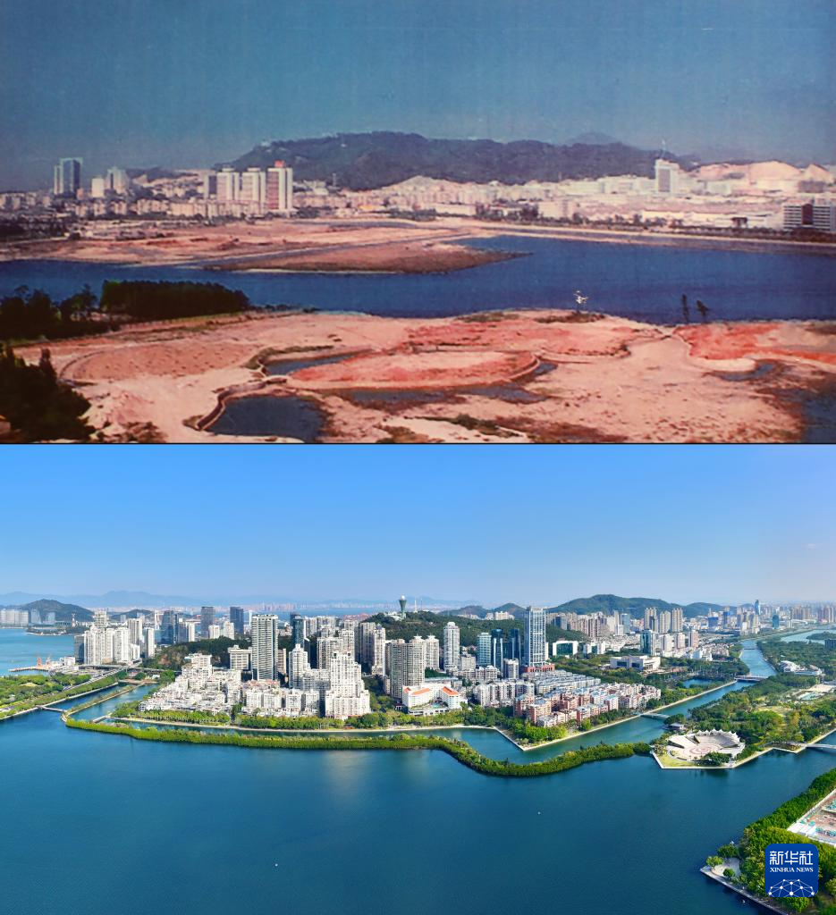 拼版照片:上圖為20世紀(jì)80年代拍攝的筼筜湖(資料照片);下圖為2024年1月24日拍攝的廈門筼筜湖及周邊城市景觀(新華社記者姜克紅攝,無人機(jī)照片)。