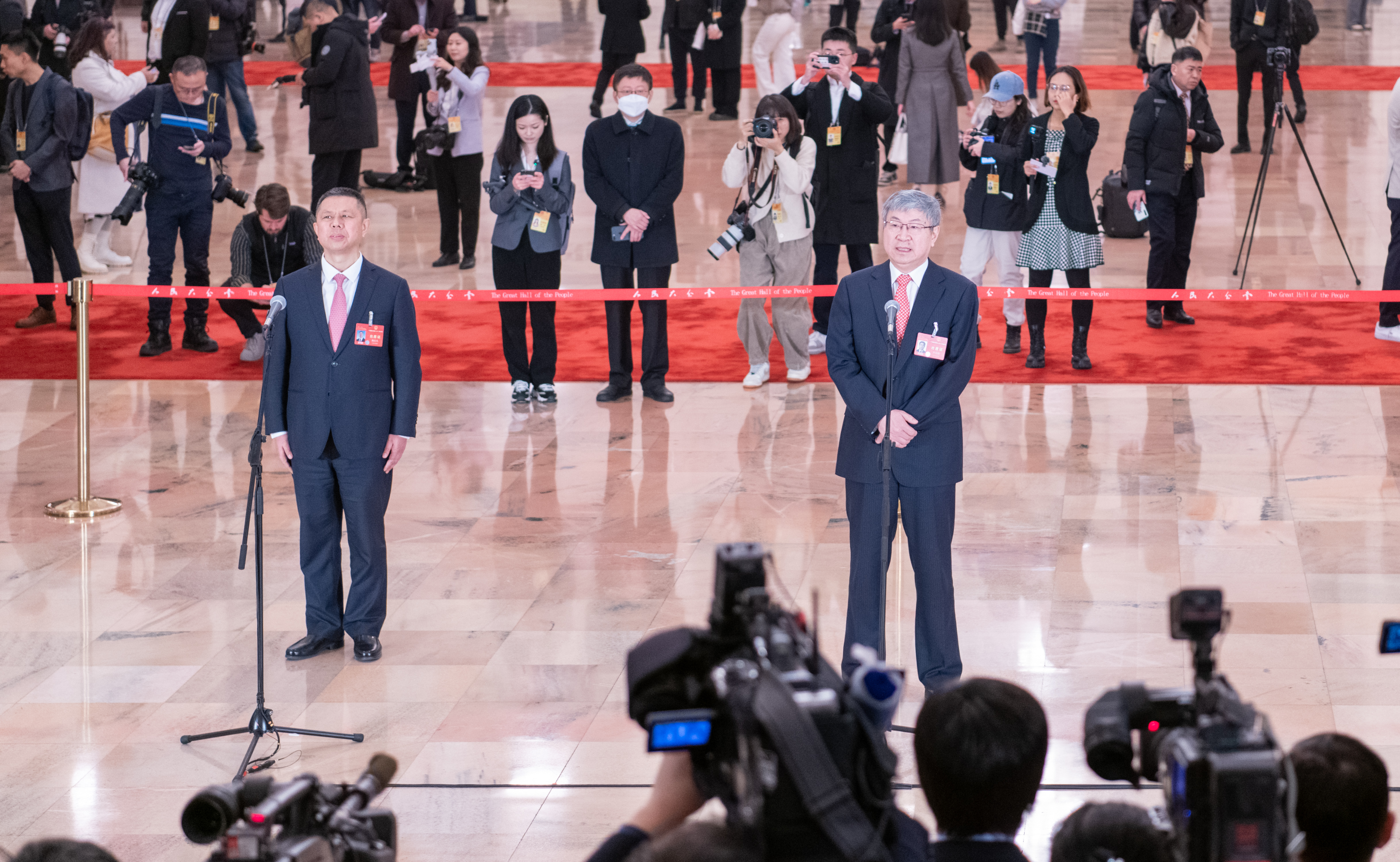 3月5日,十四屆全國人大二次會(huì)議首場(chǎng)“代表通道”采訪活動(dòng)在北京人民大會(huì)堂舉行。圖為奇瑞控股集團(tuán)董事長尹同躍代表(右)、天合光能股份有限公司董事長高紀(jì)凡代表接受記者采訪。 本報(bào)記者 王建軍 攝