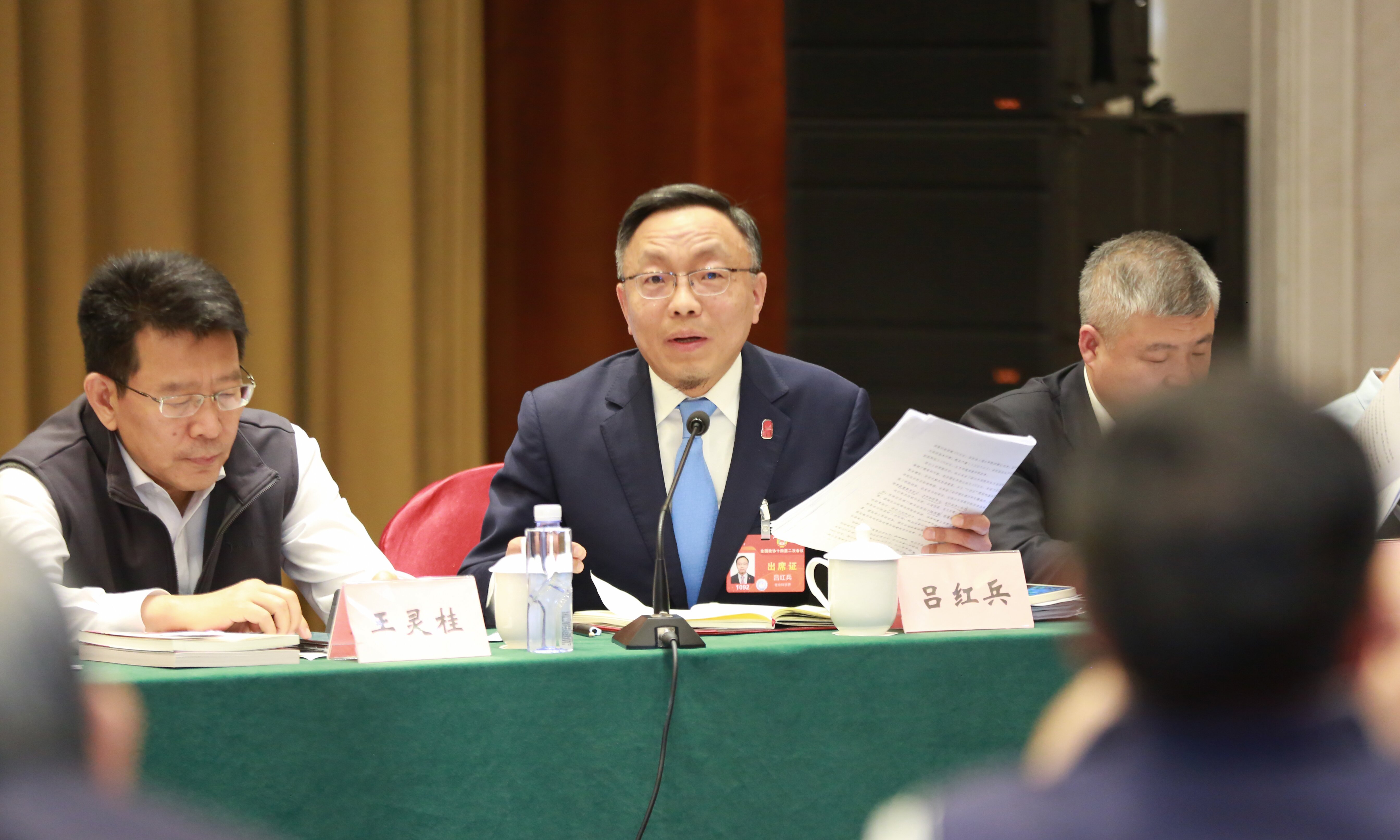 3月6日,參加全國政協(xié)十四屆二次會(huì)議界別聯(lián)組會(huì)議的中華全國律師協(xié)會(huì)監(jiān)事長呂紅兵委員(中)與參會(huì)委員交流。 本報(bào)記者 徐偉倫 攝
